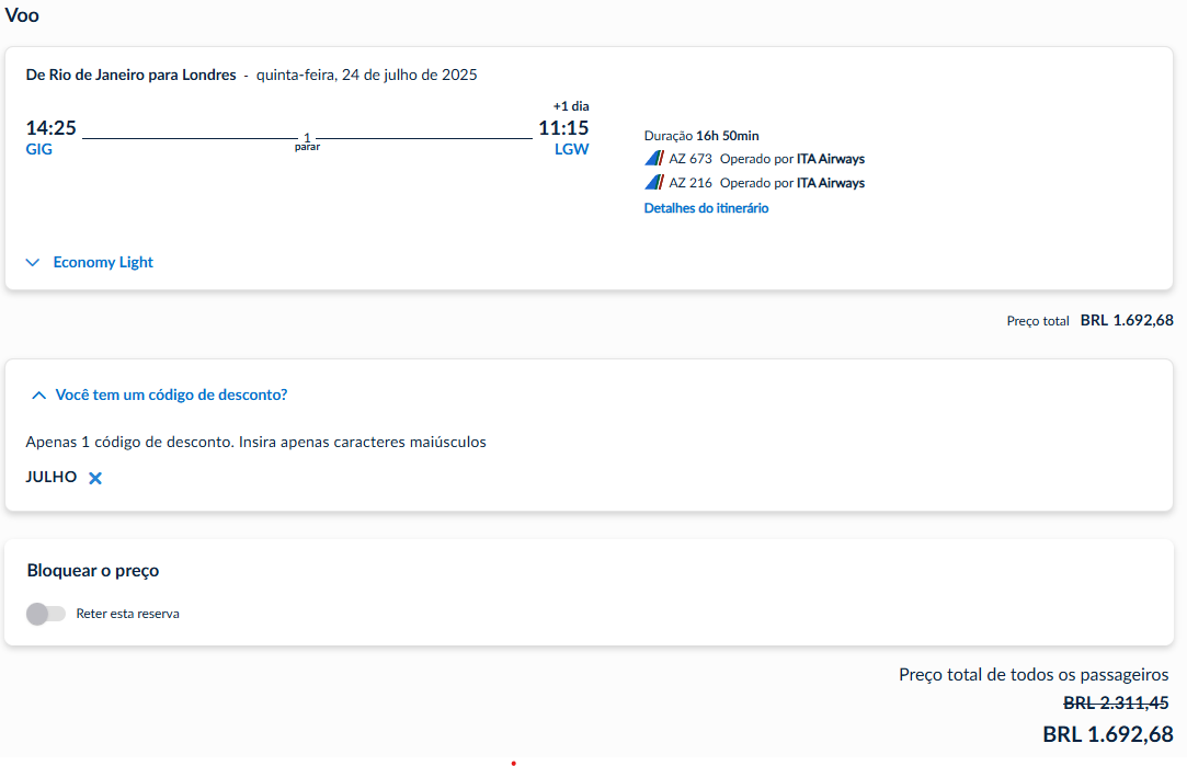 Muito bom! Para quem quer viajar neste mês de julho para qualquer destino operado pela ITA Airways, essa é uma boa oportunidade de obter passagens com valores bem interessantes.