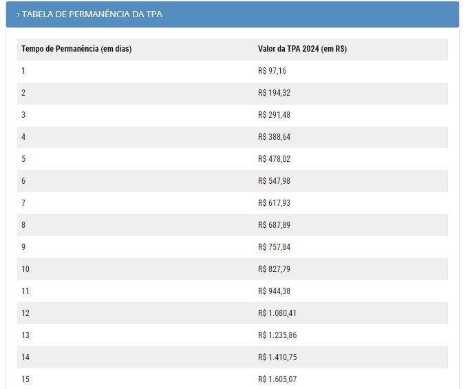 Veja abaixo a tabela com os valores da Taxa de Preservação Ambiental (TPA) do ano de 2024 referente ao tempo de permanência na ilha de até 15 dias: