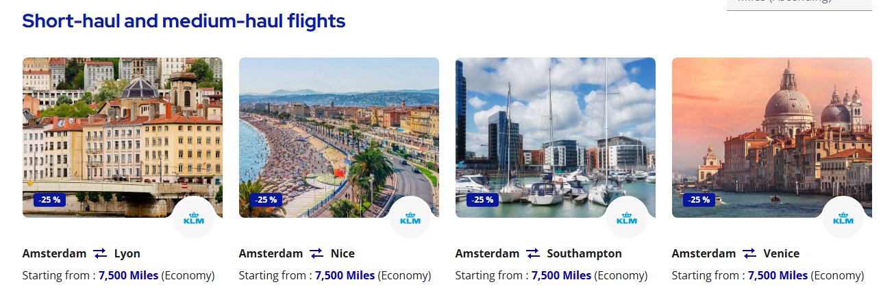 Em todo dia 1º do mês, o Flying Blue atualiza sua página de ofertas. Neste mês de outubro, está ocorrendo desconto de até 25% em diversos voos curtos, médios e longos. Em voos de curta a média distância, é possível fazer rotas a partir de 7.500 milhas saindo de Amsterdam ou Paris para diversos destinos europeus. Já a longa distância. É possível fazer viagens partindo da Europa aos Estados Unidos para cidades como Miami, Seattle, São Francisco, Nova York, Atlanta, e muito mais. Ou, ainda, os passageiros que partem da Europa podem optar por destinos como Verona, Estolcomo, Bilbao e outros.