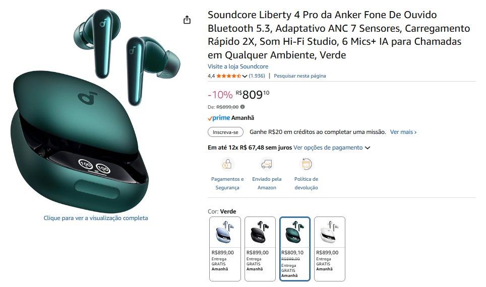 • Fone de Ouvido Soundcore |10% de desconto| total R$ 809,10 – compre aqui