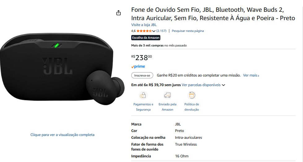 - Fones de Ouvido sem fio JBL | total R$ 238,00 – compre aqui