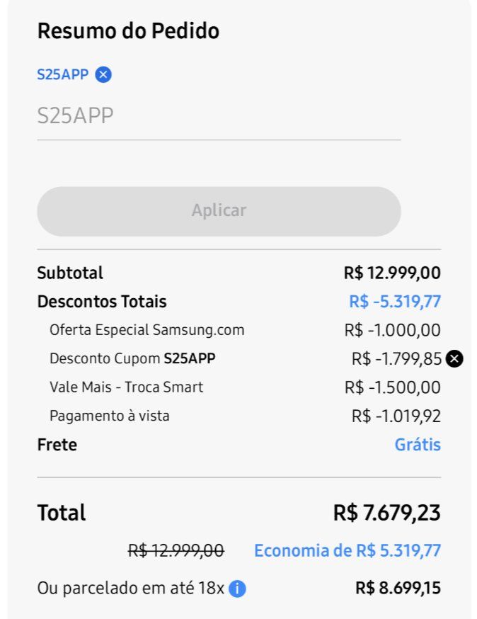- No carrinho, aplique o cupom “S25APP” [sem aspas] para obter mais R$ 1.800 de desconto;