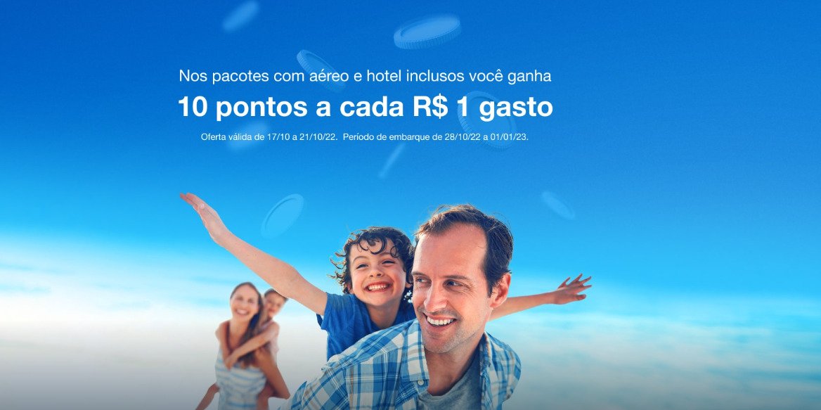 - 10 pontos por real gasto: compras de pacotes com aéreo e hotel inclusos.