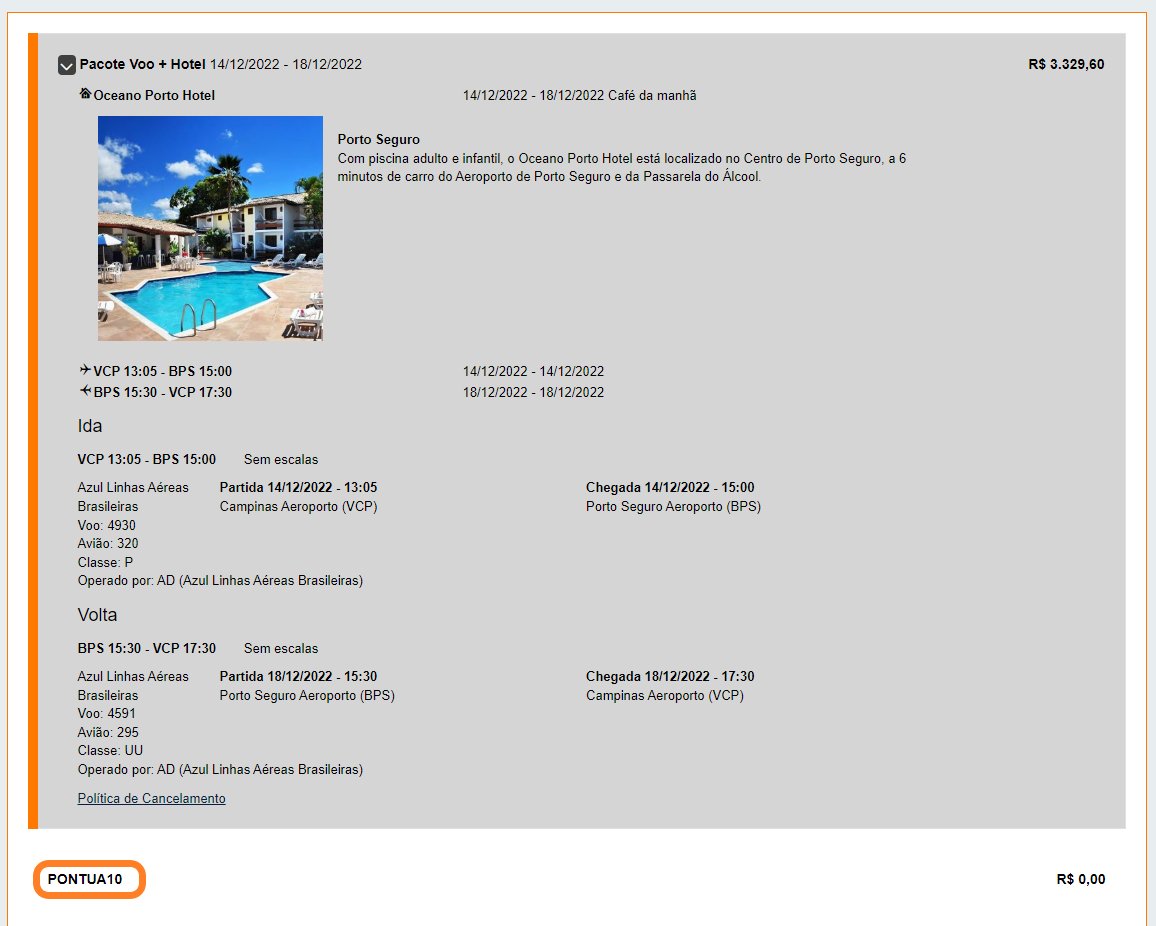 Durante o processo de compra dos pacotes, mesmo informando o cupom “PONTUA10” não é informada a quantidade de pontos que estará acumulando. Veja abaixo um exemplo de pacote de viagem para Porto Seguro, na Bahia: