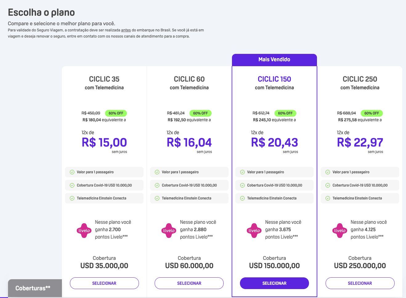 Recomendamos que você avalie os preços dos seguros da Ciclic com e sem a opção de gerar pontos na Livelo. Dessa forma, caso haja diferença de valores, opte por aquela que mais faz sentido para seu perfil.