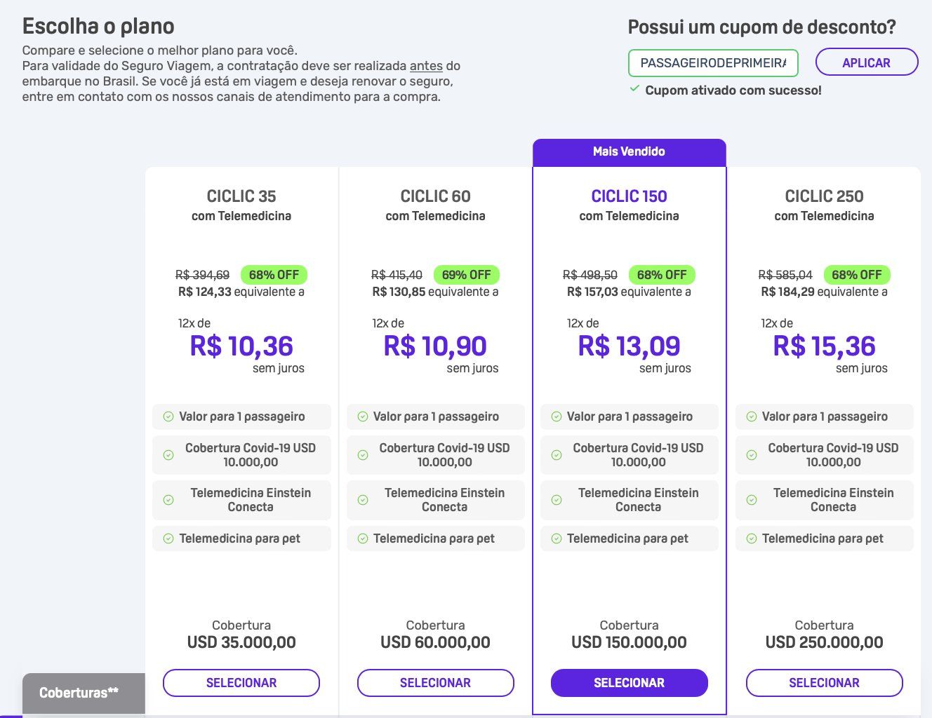 Caso o cupom se apresente como inválido, recomendamos que tente fazer novamente a simulação em outro navegador ou em aba anônima.