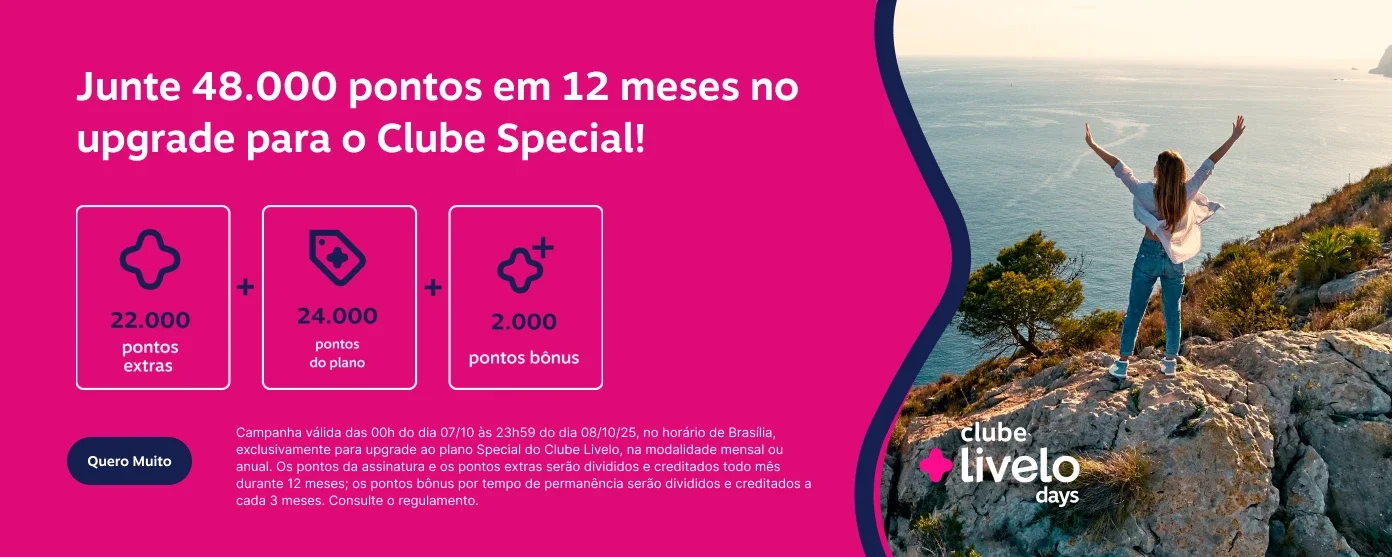 Se você já é assinante do Clube Livelo e está pensando em mudar seu plano, essa é uma boa oportunidade para ganhar 22 mil pontos bônus no upgrade para o Clube Special na modalidade mensal ou anual, totalizando 48 mil pontos no ano, podendo chegar a um CPM [custo para cada mil pontos] de R$ 19,77. A promoção é válida até quarta-feira (8) e o bônus será dividido em 12 meses. Confira!