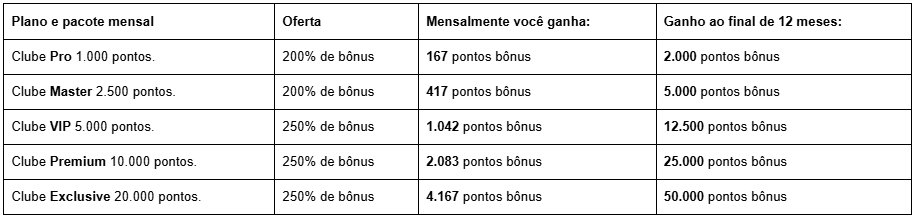 • Clube Pro: 167 pontos bônus todo mês, totalizando 14.000 pontos durante o período (acúmulo mensal + bonificação).