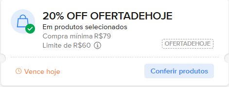 - 20% off, chegando até R$ 60 de desconto, em compras a partir de R$ 79, com o cupom ‘OFERTADEHOJE‘ [sem aspas]