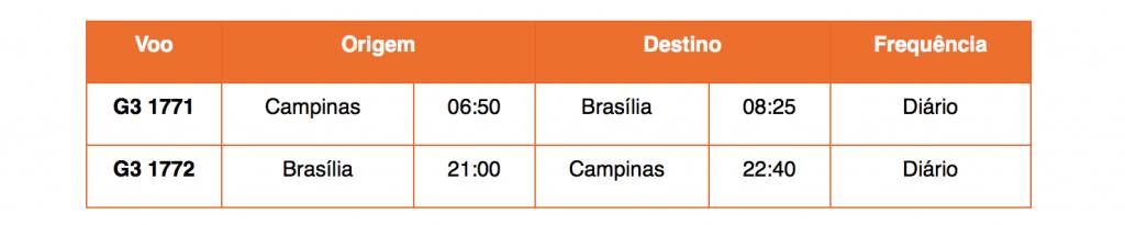 A GOL anunciou hoje uma nova rota direta entre as cidades de Brasília e Campinas, em São Paulo, com início a partir de Agosto. Os clientes terão um voo diário entre a capital federal e o aeroporto de Viracopos, ampliando as operações da companhia no interior paulista.