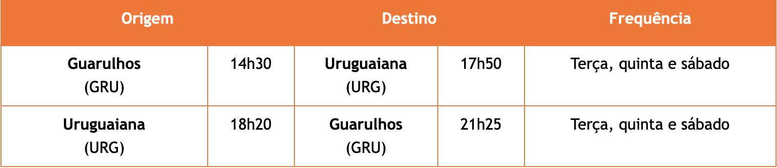 Este novo destino é fruto da parceria entre a GOL e a VOEPASS. São três frequências semanais disponíveis aos clientes: às terças, quintas e sábados, tanto a ida quanto a volta. Os bilhetes de e para Uruguaiana podem ser adquiridos exclusivamente pelos canais de venda da GOL e são operados pela companhia parceira com a aeronave ATR-72, com capacidade para 68 passageiros.