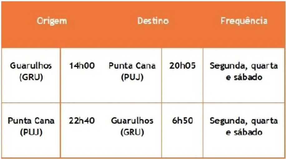 As decolagens para Punta Cana acontecem a partir do aeroporto internacional de São Paulo/Guarulhos, com três frequências semanais: às segundas, quartas e sábados, tanto a ida quanto a volta. A saída se dá às 14h00, e chegada na República Dominicana, às 20h05 (horário local). Para a volta, o voo é noturno (G3 7731), às 22h40, com aterrissagem às 6h50 em Guarulhos.