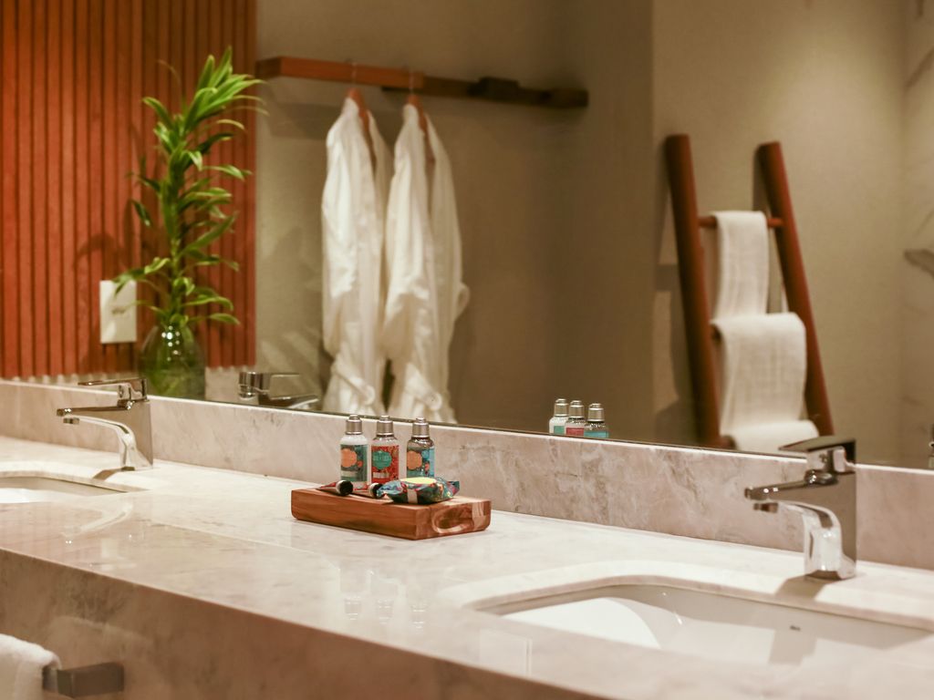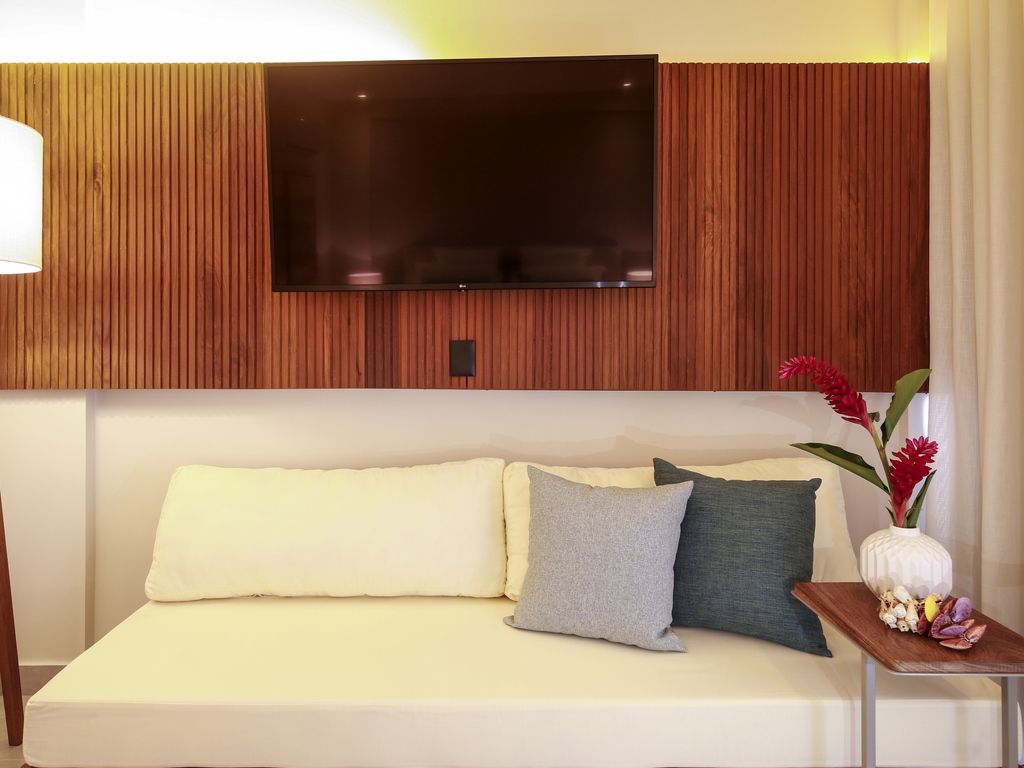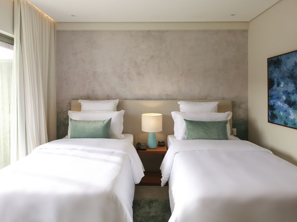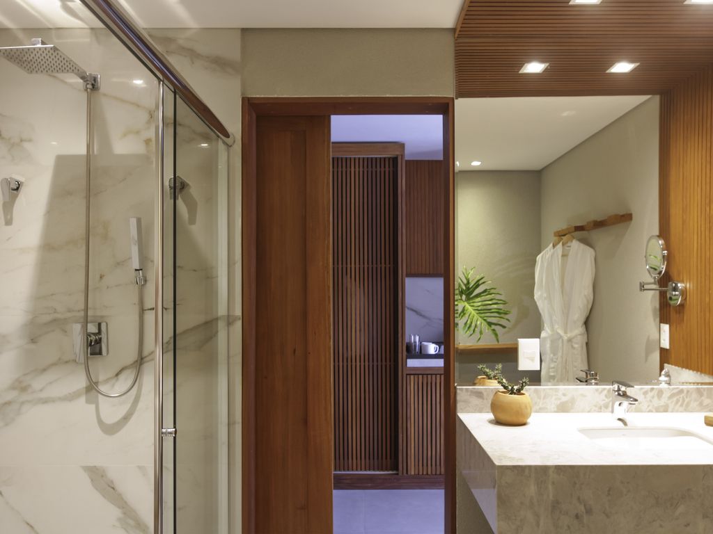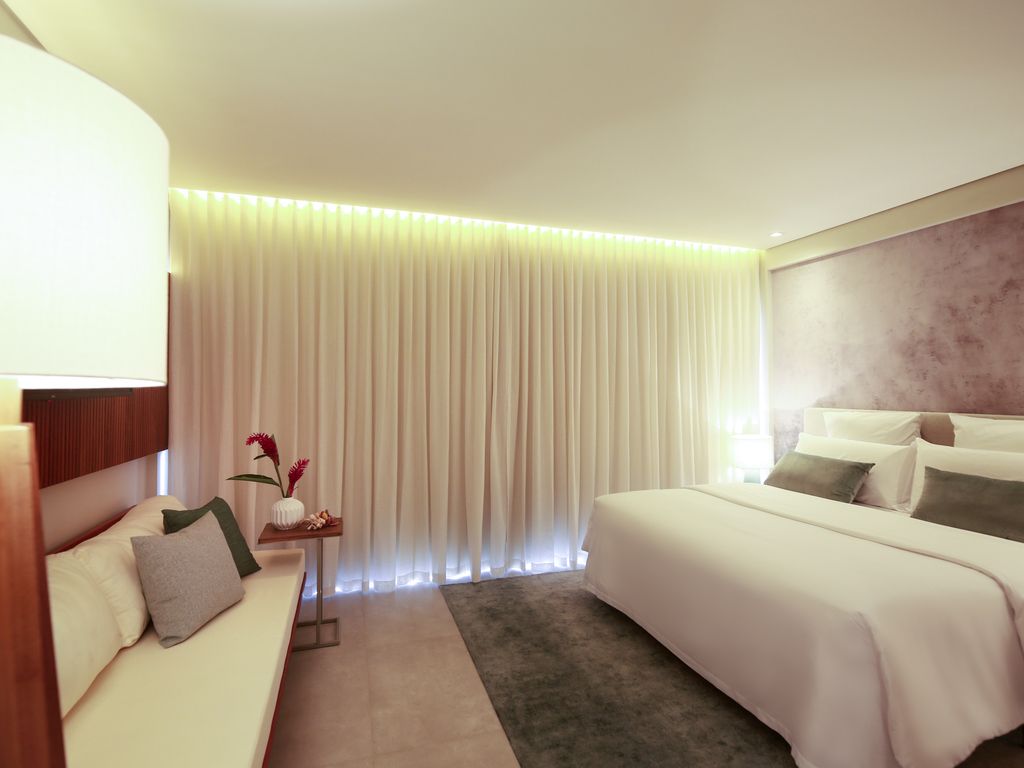 Como dissemos, o hotel conta com 79 quartos, que estão divididos em 7 categorias diferentes. Cada um deles conta com seu próprio universo estético, celebrando a elegância absoluta de materiais nobres, como o papel de parede texturizado que remete ao encontro do mar com as falésias, enquanto a vista das janelas revela os espelhos d’água nas varandas e o lago artificial de água doce, com uma areia fofa, lembrando a praia de Pipa. Desfrute de amenities L’occitane au Brésil, cofre digital, TV de 55″, internet Wi-Fi e enxoval Trousseau em todas as categorias.