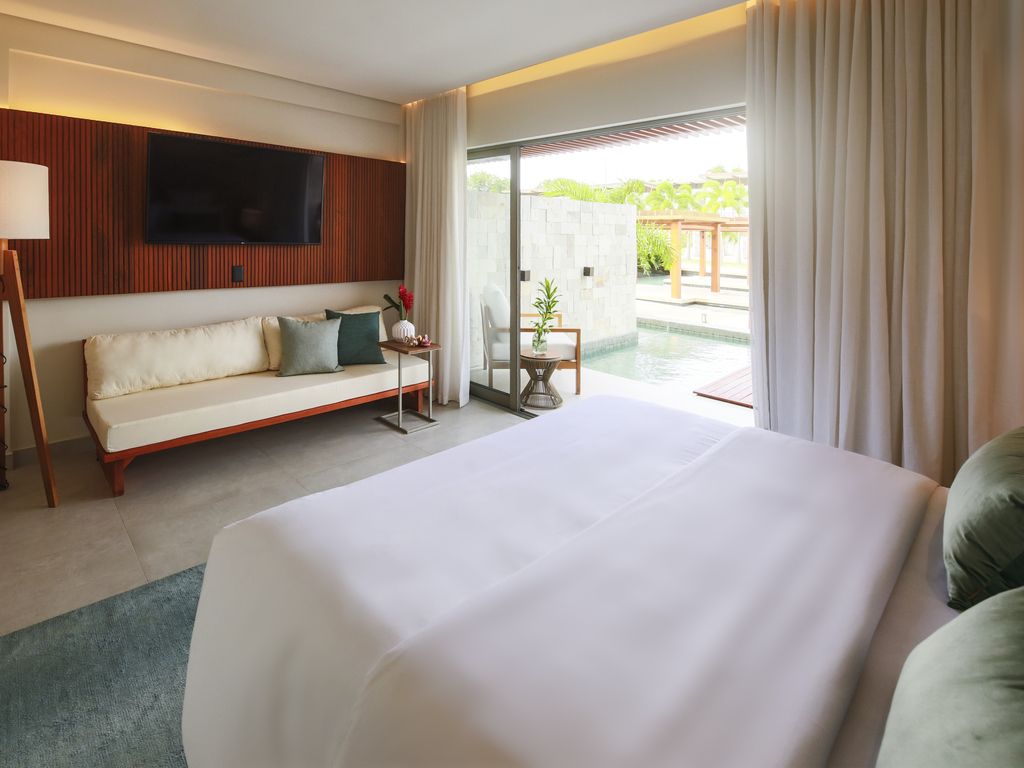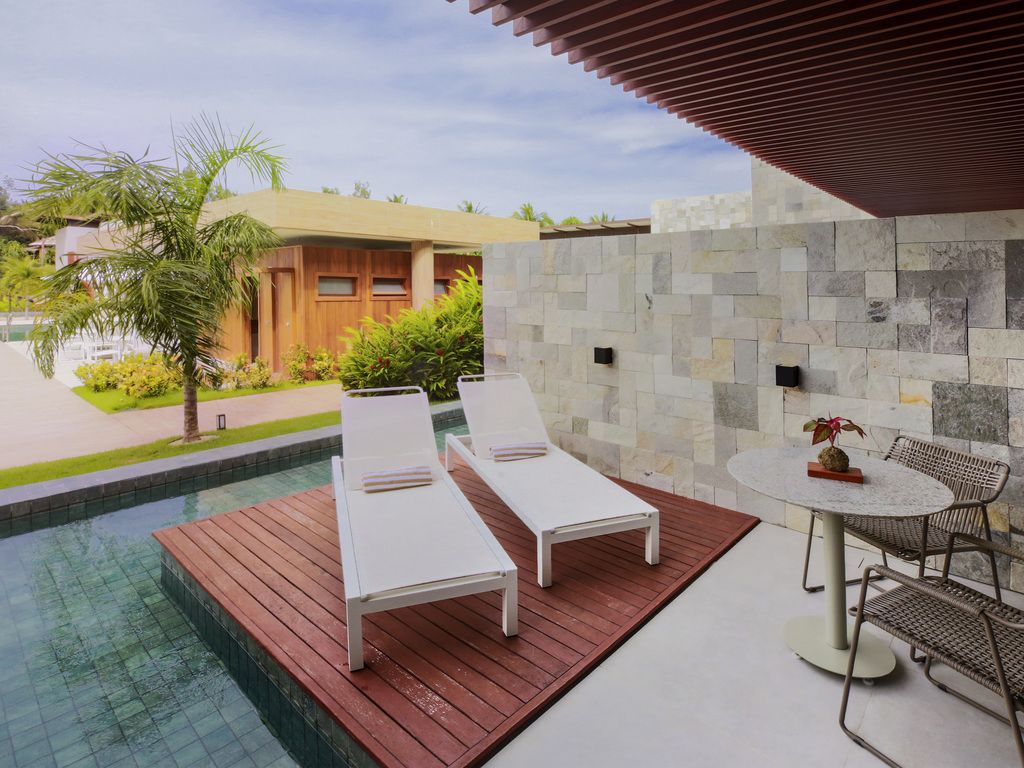 Suíte Deluxe (120 m²) com dois andares, cama king size, piscina privativa e localizada no andar térreo.