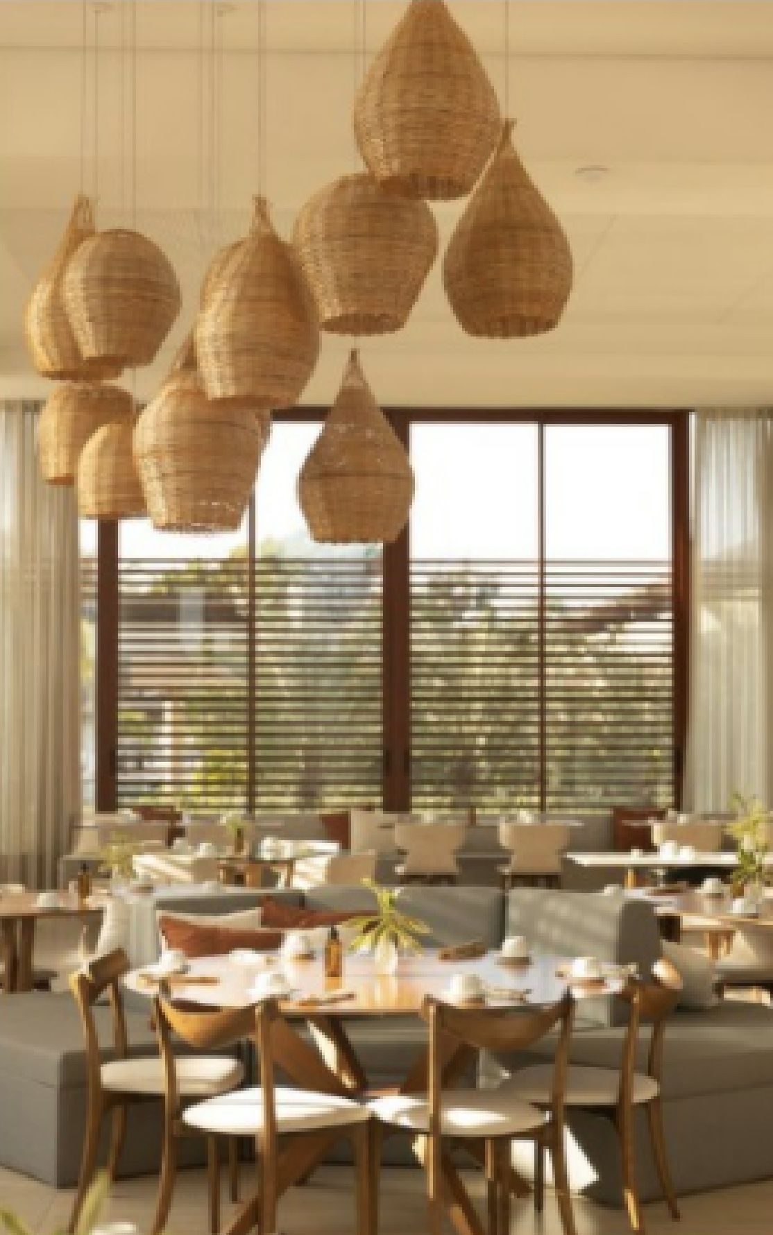 O café da manhã possui opções saudáveis, enquanto no menu à la carte no almoço ou jantar é possível desfrutar de refeições que podem ser servidas na área externa do restaurante ou dentro do salão, onde é possível assistir ao chef preparando as refeições em um show kitchen.