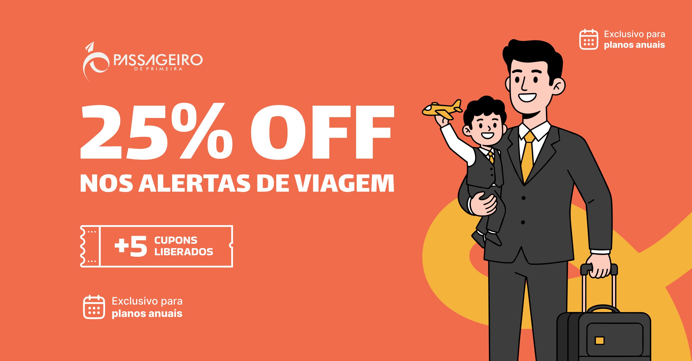 Planeje as próximas férias em família com um desconto mega especial: garanta 1 ano de Alertas com 25% OFF aplicando os cupons de uso único! O desconto vale para os planos anuais, mas é só para quem for mais rápido: as 10 primeiras pessoas que aplicarem o cupom, garantem o benefício!