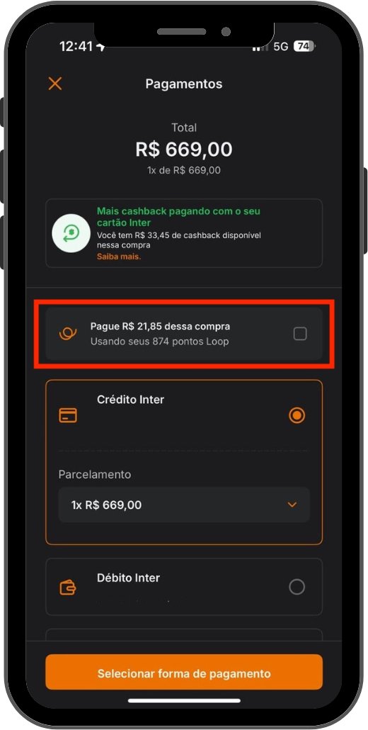 Diferente do modelo anterior, em que era necessário ter a pontuação total para realizar a compra com Loop, agora é possível combinar os pontos com pagamento via crédito ou débito Inter. Isso significa que mesmo com uma quantidade parcial de pontos, o cliente pode reduzir o valor final da compra, tornando o uso dos pontos mais acessível e vantajoso.