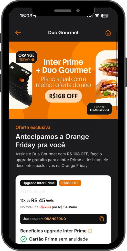 Tornar-se cliente Inter Prime já garante uma série de vantagens exclusivas. E a forma mais acessível de conseguir isso é através da assinatura do plano anual do Duo Gourmet, um programa que rapidamente se paga, especialmente para quem gosta de sair para comer fora. Esse desconto de R$ 168 da Orange Friday é uma ótima oportunidade de economizar na assinatura do Duo e ainda desfrutar de todos os benefícios do Inter Prime..