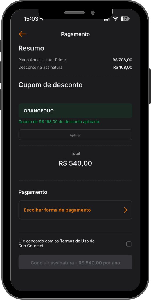 Oportunidade! O Inter está oferecendo um cupom com R$ 168 de desconto para quem assinar o plano anual do Duo Gourmet através do app do Inter, utilizando o cupom ‘ORANGEDUO‘ [sem aspas]. A promoção faz parte da campanha antecipada da Orange Friday. Além do desconto, você ainda garante um upgrade para o segmento premium Inter Prime. Saiba mais!