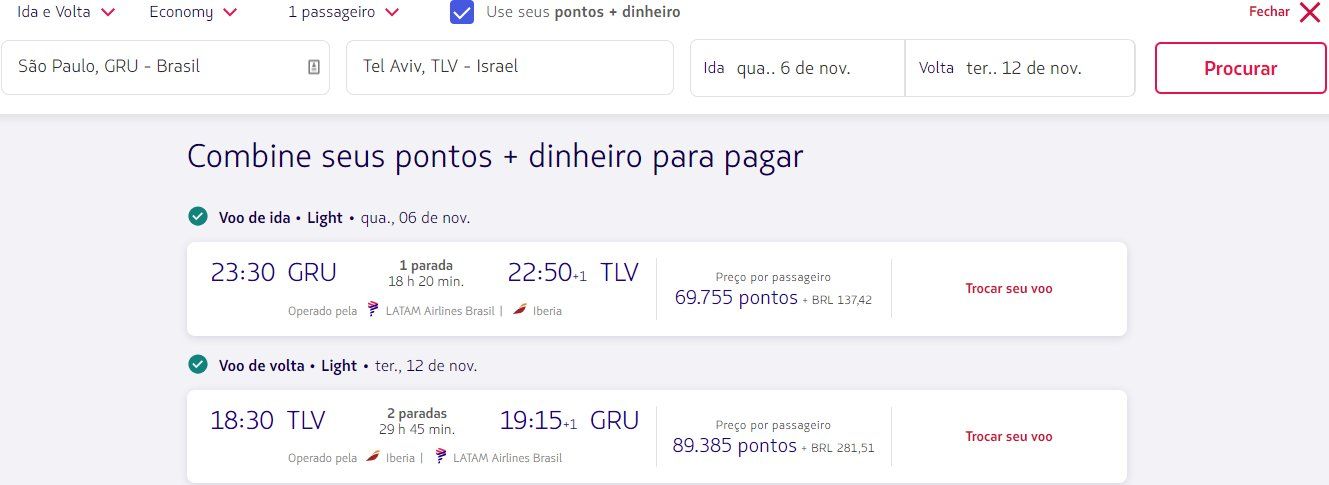 No exemplo abaixo, encontramos o trecho de ida entre São Paulo (GRU) e Tel Aviv (TLV) com conexão em Madrid (MAD) voando em Classe Econômica por 69.755 pontos + R$ 137,42 e o de volta com conexões em Madrid (MAD) e Barcelona (BCN), por 89.385 + R$ 281,51 em voos com a Iberia e LATAM. Os preços, neste caso, serão sempre menores em viagens de ida e volta.