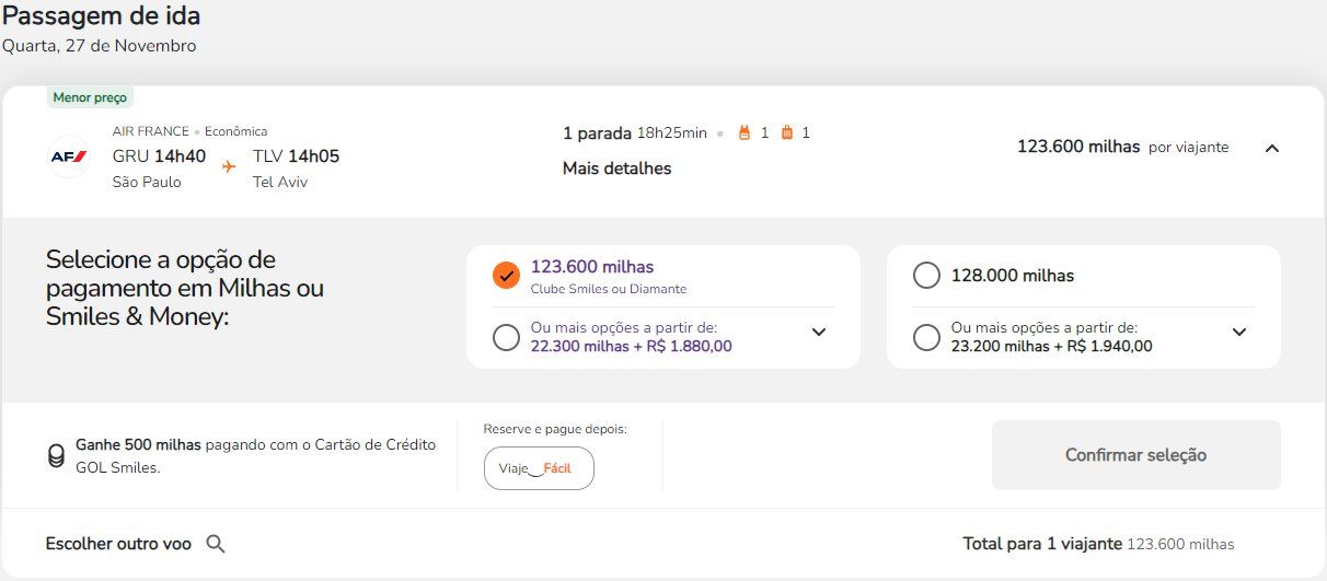 Veja abaixo um exemplo em Classe Econômica com a KLM para Tel Aviv (TLV) partido aeroporto de São Paulo (GRU) e realizando conexão em Amsterdã.