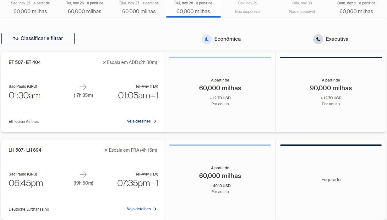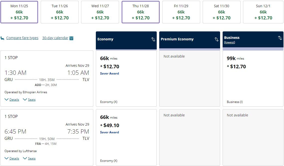 No MileagePlus, assim como no programa da Copa, é possível emitir voos tanto com as companhias parceiras da Star Alliance, quanto com a Azul. O programa precifica a emissão em 66.000 milhas para Classe Econômica e 99.000 milhas para Classe Executiva com companhias parceiras. Da mesma forma que o ConnectMiles, o programa também não cobra taxa de combustível (YQ). Veja abaixo um exemplo entre São Paulo (GRU) e Tel Aviv (TLV), voando Ethiopian com conexão em Adis Abeba (ADD), em Classe Econômica e Executiva ou com a Lufthansa realizando conexão em Frankfurt (FRA):