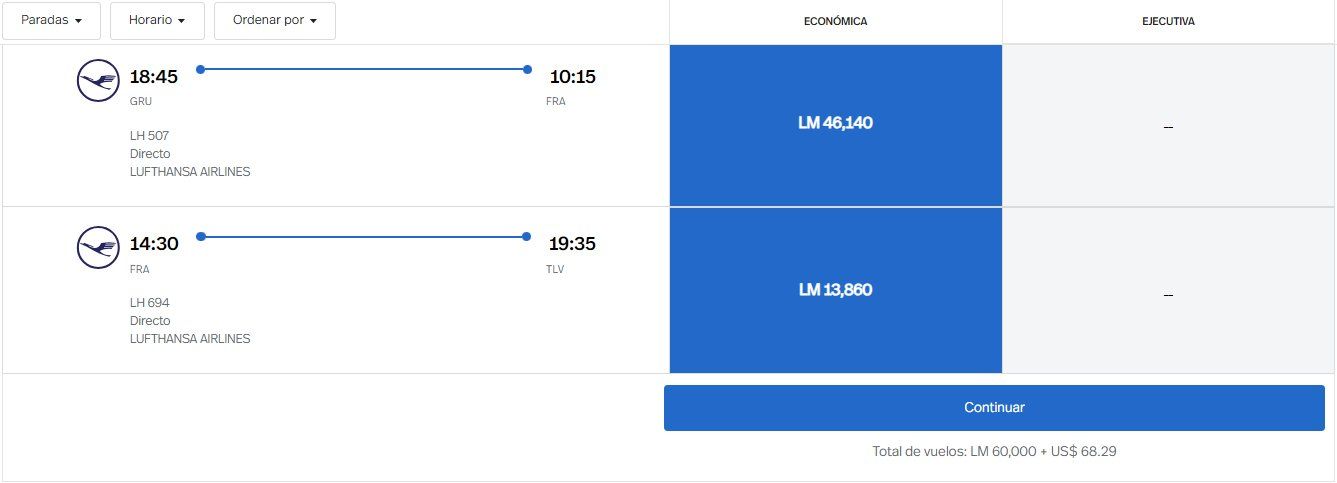 Assim como os programas anteriores, o lifemiles também não repassa a taxa de combustível (YQ). Veja abaixo um exemplo entre São Paulo (GRU) e Tel Aviv (TLV) em voo com conexão em Frankfurt com a Lufthansa: