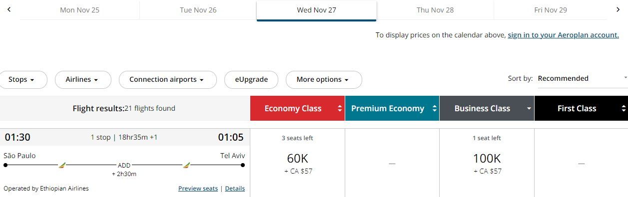 O Aeroplan da Air Canada precifica o trecho em 60.000 milhas em Classe Econômica e 100.000 milhas em Classe Executiva para voos com as companhias parceiras da Star Alliance como a Ethiopian, Lufthansa e Turkish, por exemplo. Cabe ressaltar que o programa não cobra a desagradável taxa de combustível (YQ). Veja abaixo um exemplo entre São Paulo (GRU) e Tel Aviv (TLV) em voo com conexão em Adis Abeba com a companhia Ethiopian em Classe Econômica e Executiva: