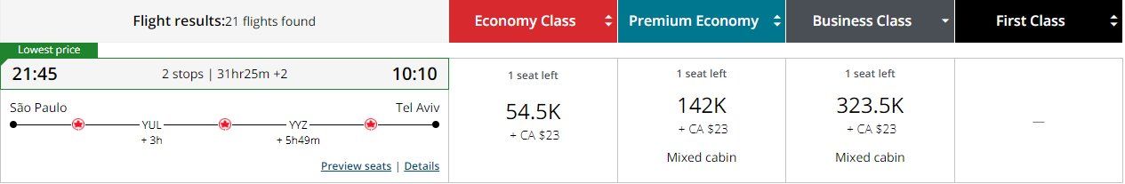 No Aeroplan, é possível emitir voos da própria Air Canada com conexões no Canadá e com precificação dinâmica. Para o nosso destino encontramos voos com a Air Canada precificada em 54.500 milhas para Classe Econômica e 142.000 milhas para Classe Executiva: