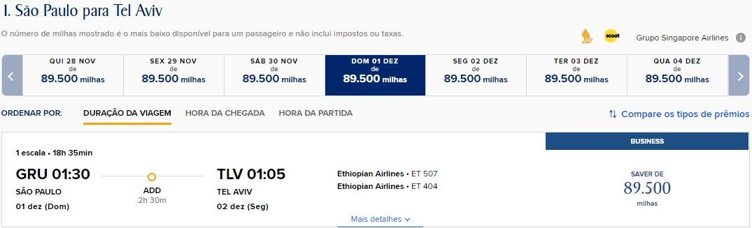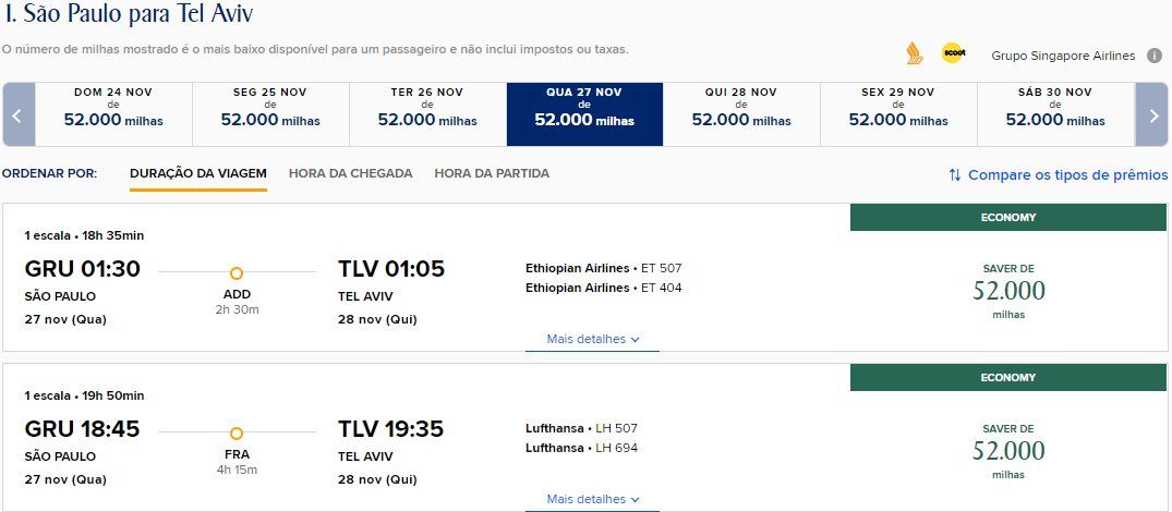 Já o Krisflyer, programa da Singapore Airlines, cobra 52.000 milhas em Classe Econômica nos voos partindo do Brasil para Israel em companhias parceiras da Star Alliance. Já para a Classe Executiva, o valor cobrado é de 89.500 milhas. A má notícia fica por conta do programa repassar taxas de combustível de voos que partem de fora do Brasil. Veja abaixo um exemplo entre São Paulo (GRU) e Tel Aviv (TLV) em voo com conexão em Adis Abeba com a companhia Ethiopian em Classe Econômica ou com a Lufthansa realizando conexão em Frankfurt (FRA):