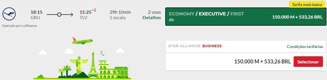 O ConnectMiles precifica de forma fixa os trechos entre o Brasil e o Oriente Médio (onde Israel está localizado na tabela ConnectMiles), com o custo de 60.000 o trecho em Classe Econômica e 90.000 em Classe Executiva. No programa, é possível emitir voos com todas as companhias parceiras da Star Alliance, além de parceiras bilaterais como a Emirates. Entretanto, emissões com a companhia dos Emirados só são possíveis via call center. Seja qual for a companhia escolhida, o custo será sempre o mesmo, dependendo apenas da disponibilidade de datas. Vale ressaltar que o programa não cobra taxa de combustível (YQ). Veja abaixo um exemplo entre São Paulo (GRU) e Tel Aviv (TLV), voando Ethiopian com conexão em Adis Abeba (ADD), em Classe Econômica e Executiva ou com a Lufthansa realizando conexão em Frankfurt (FRA):