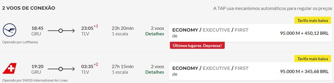 O TAP Miles&Go permite emissões em voos próprios da TAP ou com parceiras. Para Tel Aviv (TLV), é possível emitir voos com a Emirates ou companhias da Star Alliance. Para os voos com companhias parceiras, o preço é fixo, com 75.000 milhas em Classe Econômica e 150.000 em Executiva. As emissões com algumas companhias, como a Emirates e a Turkish, há o repasse da taxa de combustível inclusive para voos saindo do Brasil. Veja abaixo exemplos entre São Paulo (GRU) e Tel Aviv (TLV) em Classe Econômica, realizando conexão em Frankfurt com a Lufthansa ou em Zurique com a SWISS: