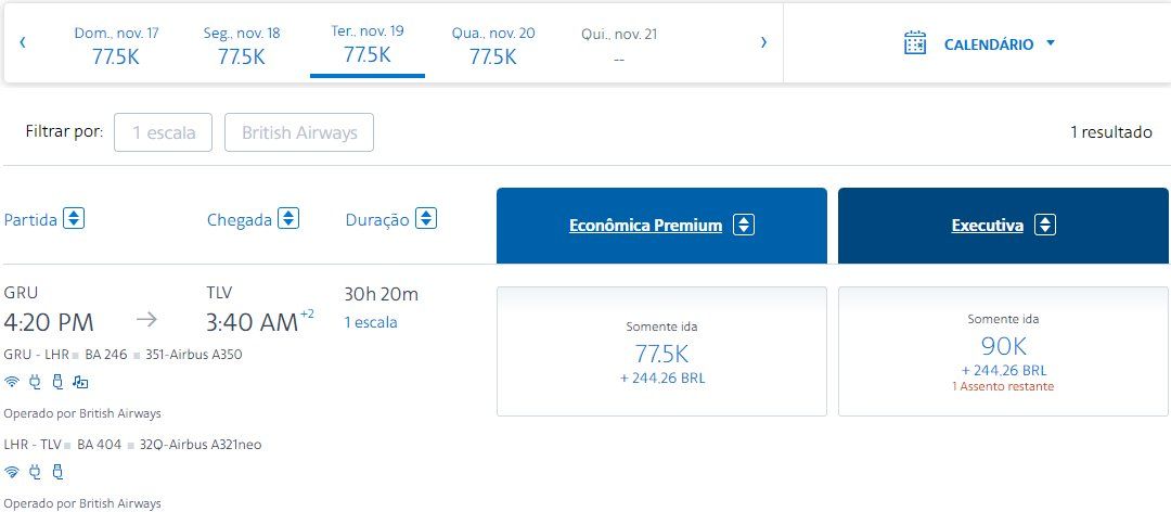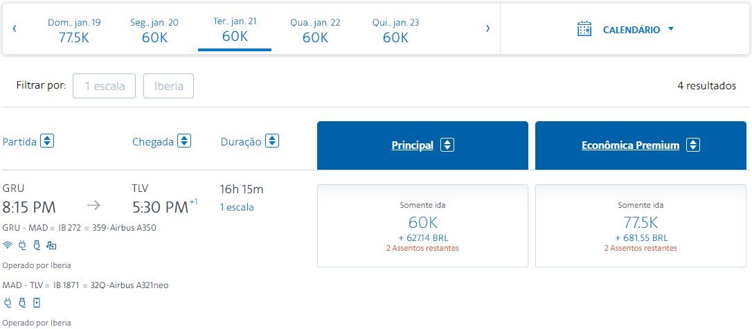 O programa precifica em 42.500 milhas o voo entre São Paulo (GRU) e Tel Aviv (TLV) em Classe Econômica. No momento da elaboração dessa matéria o programa só apresentou disponibilidade em Classe Econômica com a Iberia. Já em Premium Economy foi possível encontrar disponibilidade com a British: