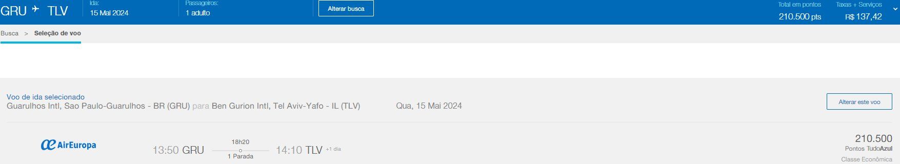No Azul Fidelidade, existe a possibilidade de emitir voos com pontos em companhias parceiras através do Interline Azul, agora chamado de “Azul pelo Mundo em pontos”. Para Israel, é possível emitir voos com a Air Canada, Emirates, Turkish e United, uma vez que são as parceiras do programa que oferecem tarifas award. No momento da elaboração desta matéria não encontramos disponibilidade award com nenhuma das companhias parceiras. No entanto, segue um exemplo de emissão em tarifa comercial para o voo entre o São Paulo (GRU) e Tel Aviv (TLV) em classe econômica por 210.500 pontos Azul Fidelidade + R$ 137,42 em taxas.