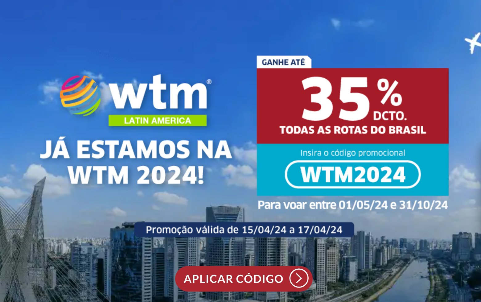 A campanha promocional que vai até amanhã (17) permite que você compre voos de qualquer rota no Brasil com 35% de desconto inserindo o cupom “WTM2024” [sem aspas] no site da JetSMART. No entanto, não se esqueça que o cupom só é válido para voos entre os dias 01 de maio e 31 de outubro de 2024.