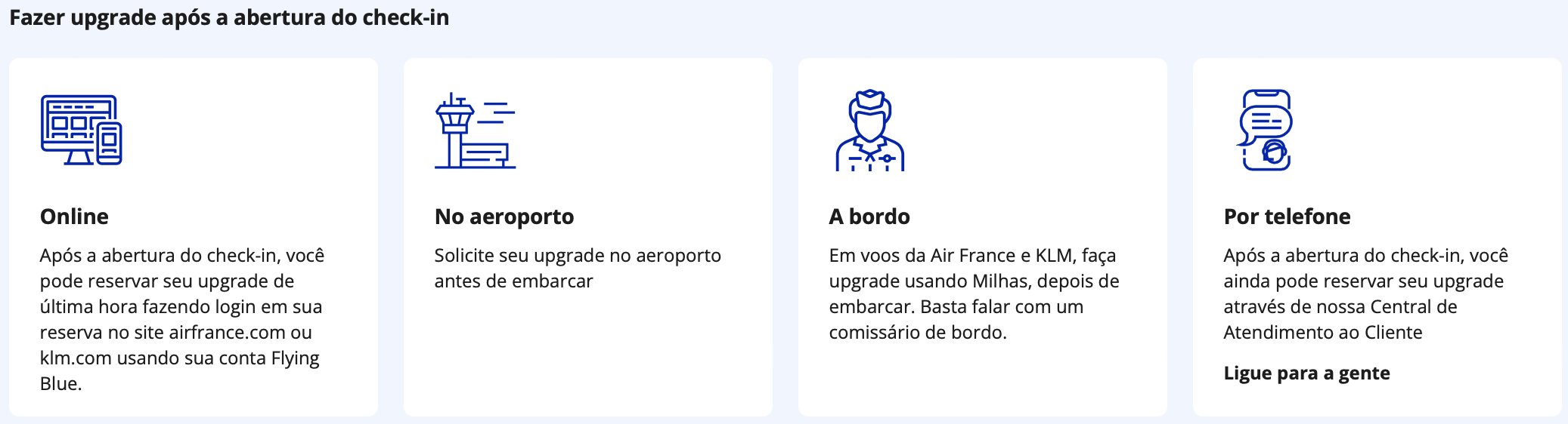 No entanto, após a abertura do check-in, o upgrade também está disponíveis online, no aeroporto e até a bordo. Estes upgrades de última hora podem ser pagos em milhas, em dinheiro ou uma combinação dos dois. Todos os upgrades estão sujeitos à disponibilidade e, por regra, passagens adquiridas com milhas de programas parceiros não são elegíveis a upgrade.