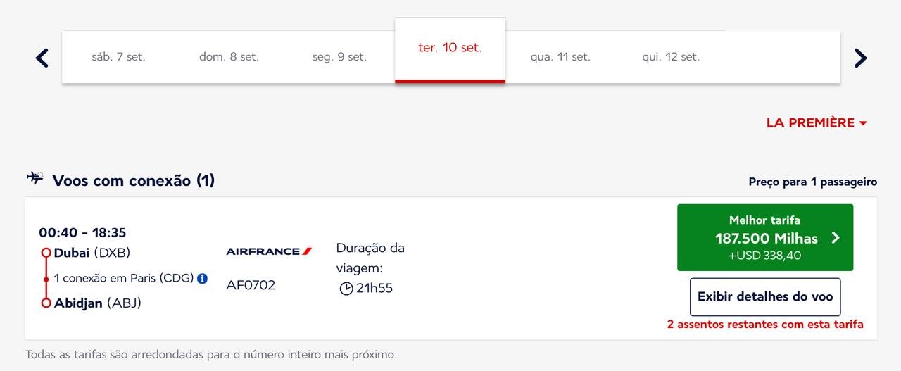 Mas, sem dúvidas, procurar destinos com conexão pode ser uma ótima dica, considerando o preço pago e as horas de voo efetivamente atribuídas. Isso porque os valores entre cidades com escala em Paris nem sempre são somados. Um exemplo disto é essa emissão de Dubai (DXB) para a Abidjan (ABJ), na Costa do Marfim, na qual são cobradas apenas 37.500 a mais do que o trecho até Paris (CDG). No entanto, estamos falando de dois trechos em Primeira Classe em voos que percorrem mais de 3.000 milhas de distância.