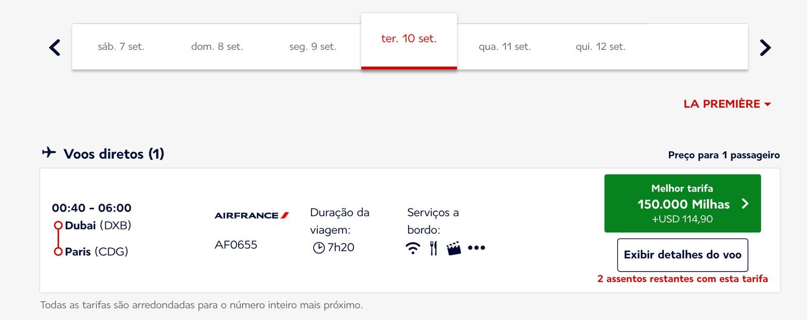 Os valores entre Dubai e Paris começam em 150 mil milhas, sendo essa uma das emissões com melhor valor absoluto em milhas no programa. Repare que, neste exemplo, são cobrados US$ 114,90 em taxas.