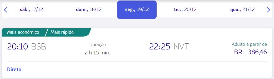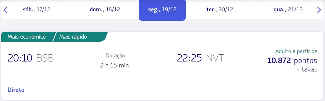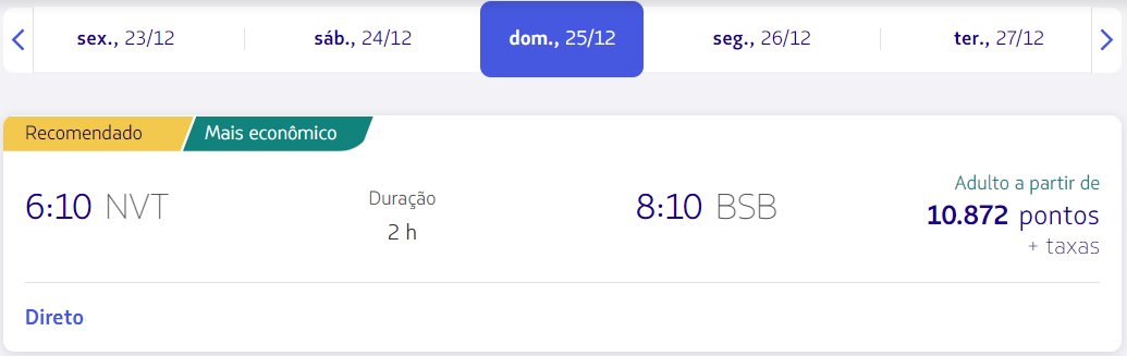 Em nossas buscas no site da LATAM, encontramos trechos a partir 10.782 pontos LATAM Pass ou R$ 386,46, na rota Brasília-Navegantes: