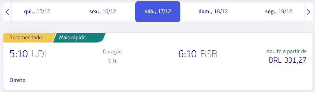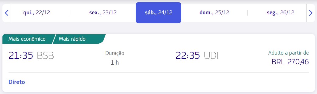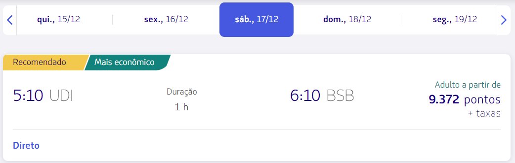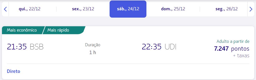 Já na rota Brasília-Uberlândia, encontramos trechos a partir 7.247 pontos LATAM Pass ou R$ 270,46: