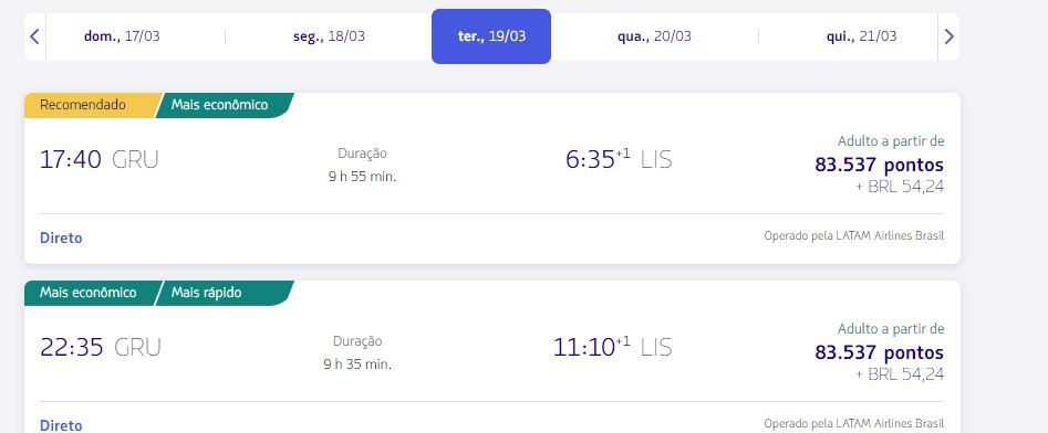 Em nossas pesquisas, realizada no dia 7 de novembro, encontramos trecho para o dia 19 de março de 2024, a partir de  83.537 pontos + R$ 54,24 de taxas . Confira abaixo: