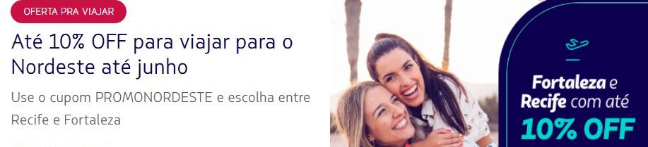 - Até 10% de desconto na compra de passagens pagantes para Fortaleza e Recife (destino e/ou origem) mediante a utilização do cupom ‘PROMONORDESTE’ [sem aspas].