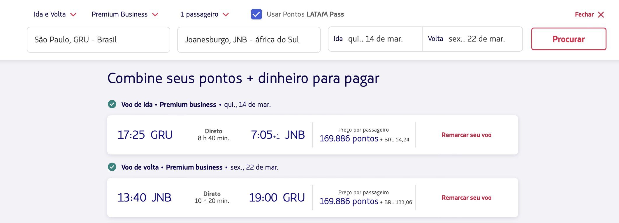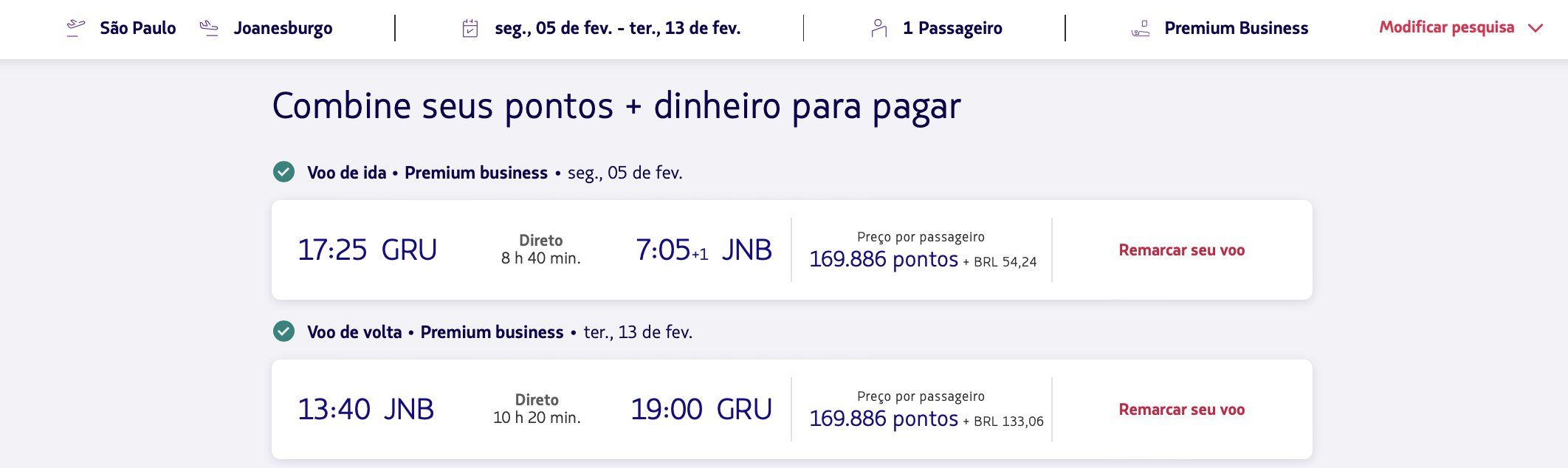 Procurando uma viagem entre o Brasil e a África do Sul em Classe Executiva? Durante nossas buscas encontramos passagens de ida e volta para Joanesburgo (JNB) no voo direto de São Paulo (GRU) a partir de 169.886 pontos + taxas. Além disso, o programa está oferecendo até 66% de desconto na compra de pontos, o que pode ajudar na hora de emitir o bilhete.