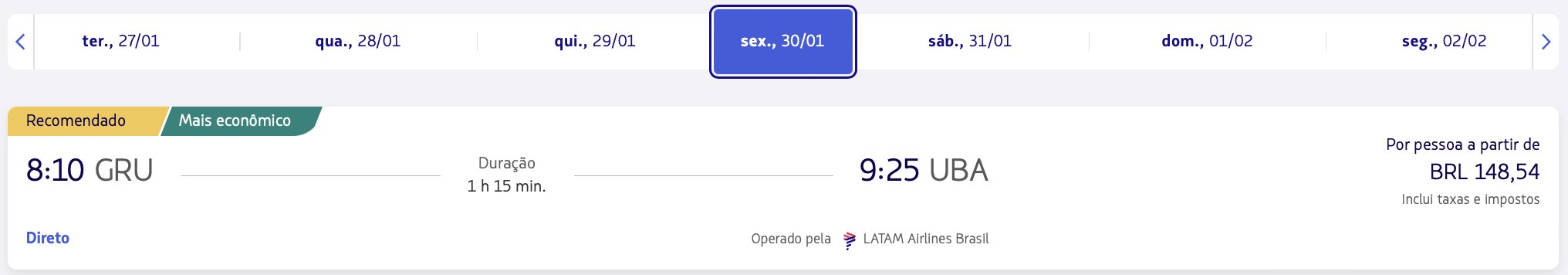 Em nossas buscas, encontramos valores promocionais para passagens nacionais da LATAM. Veja a seguir alguns exemplos: