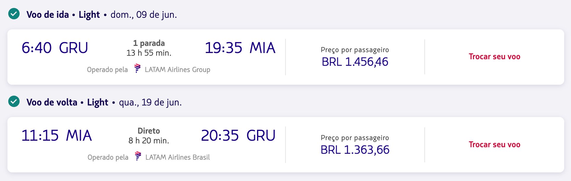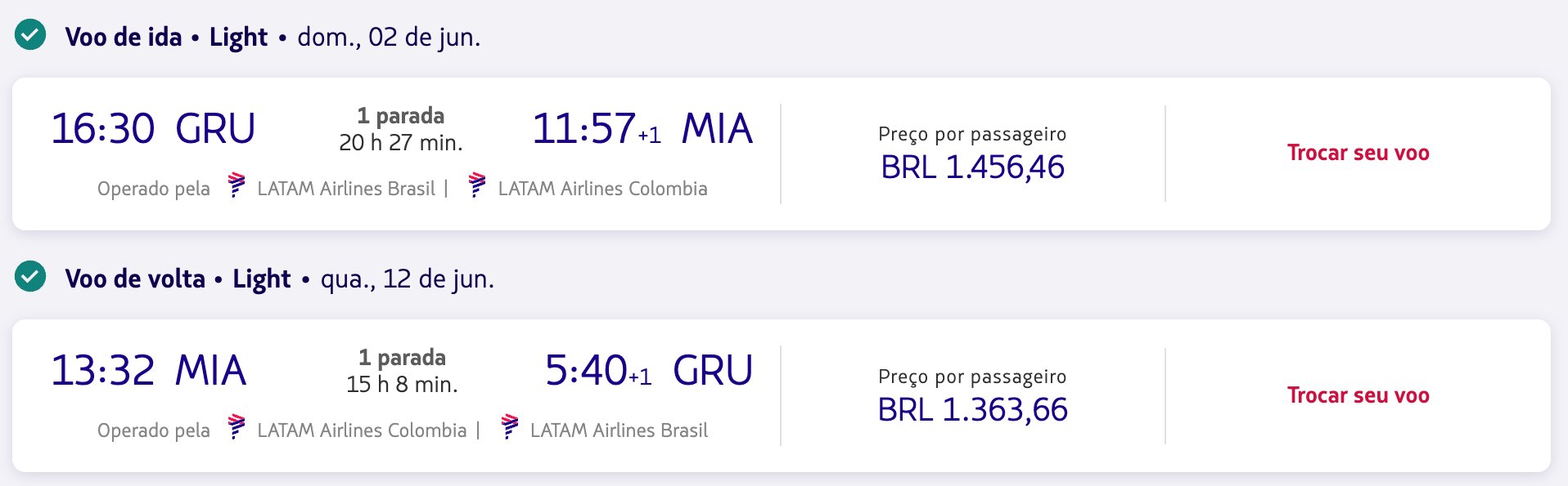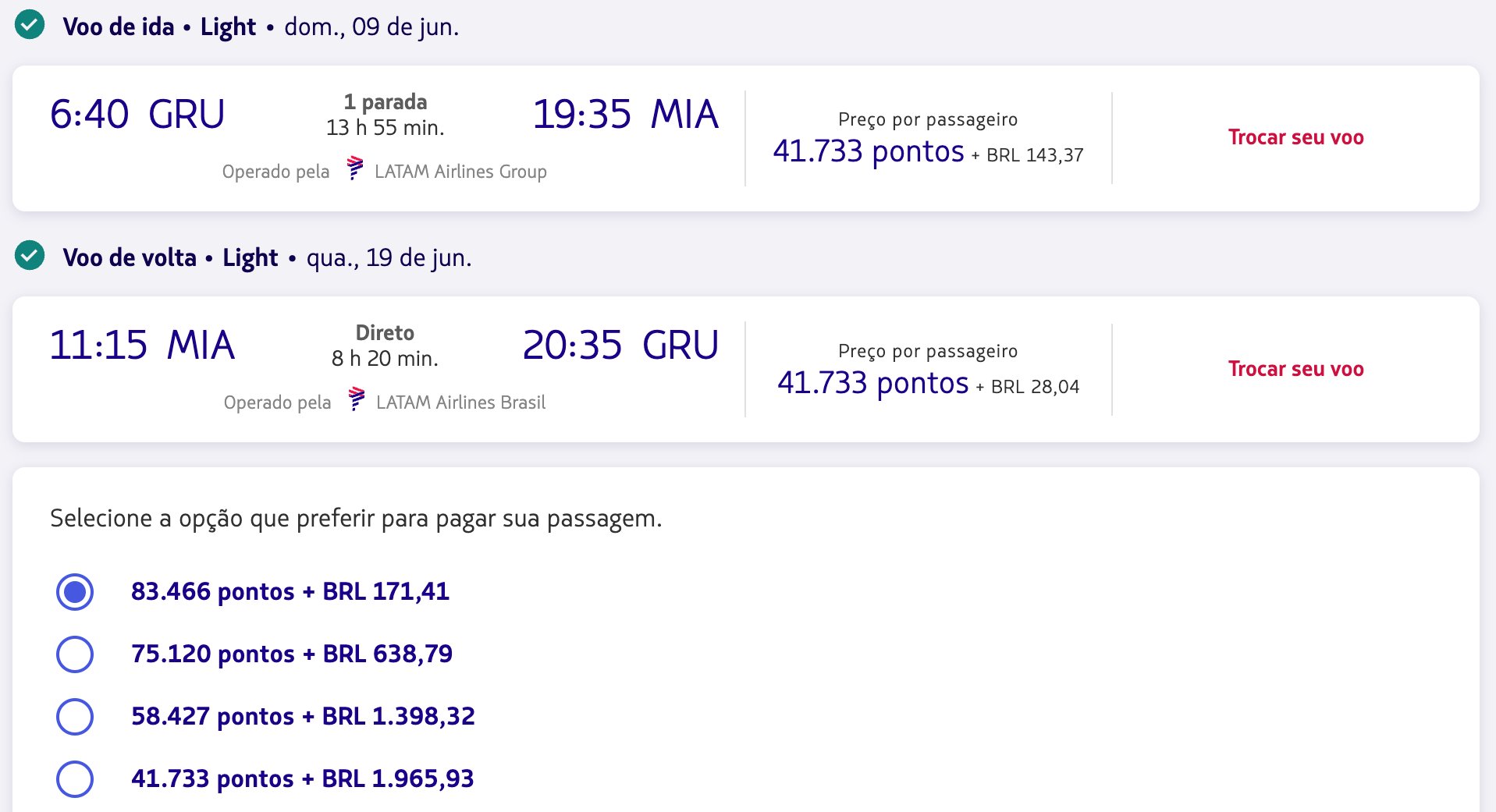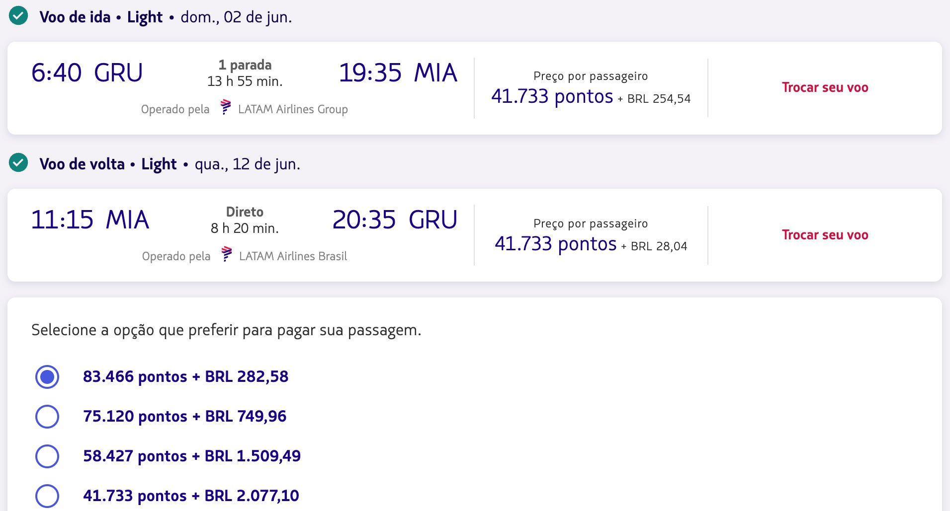 São Paulo (GRU) x Miami (MIA): 83.466 pontos + R$ 282,58 de taxas: