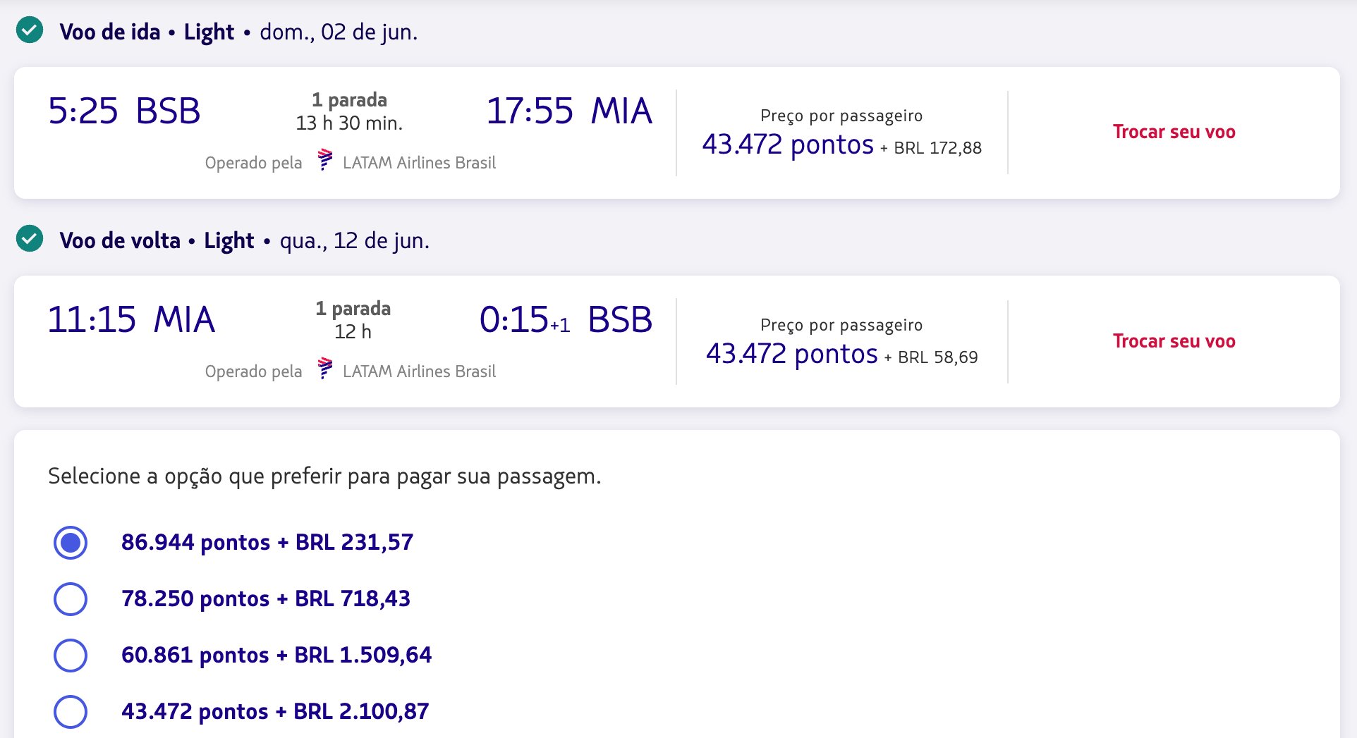 Brasília (BSB) x Miami (MIA): 86.944 pontos + R$ 231,57 de taxas:
