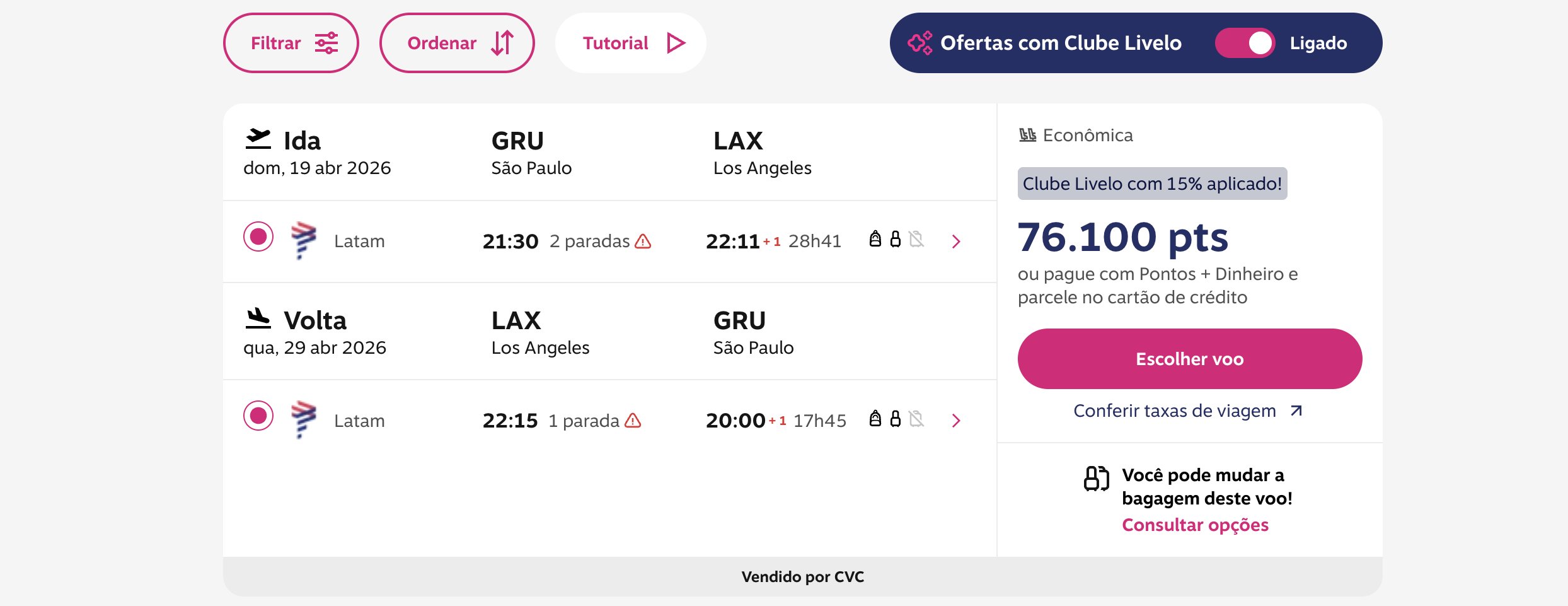 Veja abaixo um exemplo de passagem de São Paulo (GRU) para Los Angeles (LAX) usando pontos Livelo: