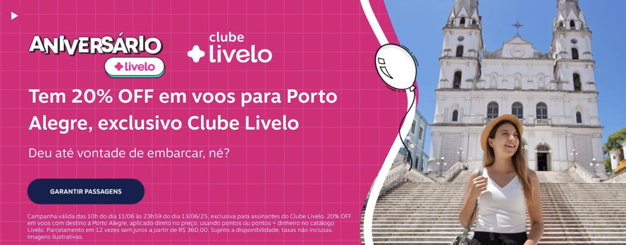 A campanha oferece 20% de desconto no resgate de passagens aéreas para Porto Alegre, em qualquer período, para assinantes do Clube Livelo. O desconto é aplicado direto no preço, usando pontos ou pontos + dinheiro. Ainda é possível parcelar em 12 vezes sem juros na utilização do “pontos + dinheiro” a partir de R$ 360,00.