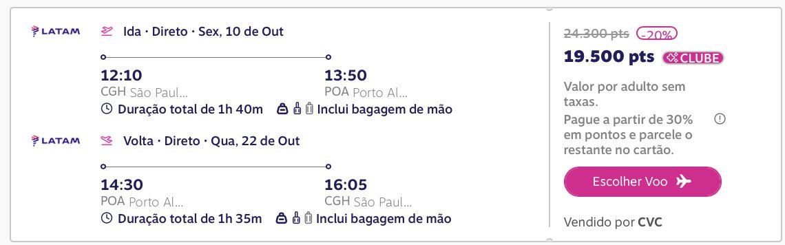 Para quem está planejando visitar Porto Alegre e tem pontos na Livelo, a promoção pode ser uma boa chance de garantir seu voo com 20% de desconto. Além disso, caso você não tenha pontos suficientes para emitir uma passagem, a Livelo oferece a opção de juntar pontos + dinheiro, com opção de parcelamento em até 12x sem juros.