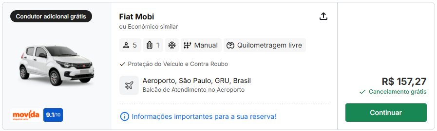 Note que, durante o processo de aluguel na Rentcars, não é possível ver a quantidade de pontos que será acumulada.